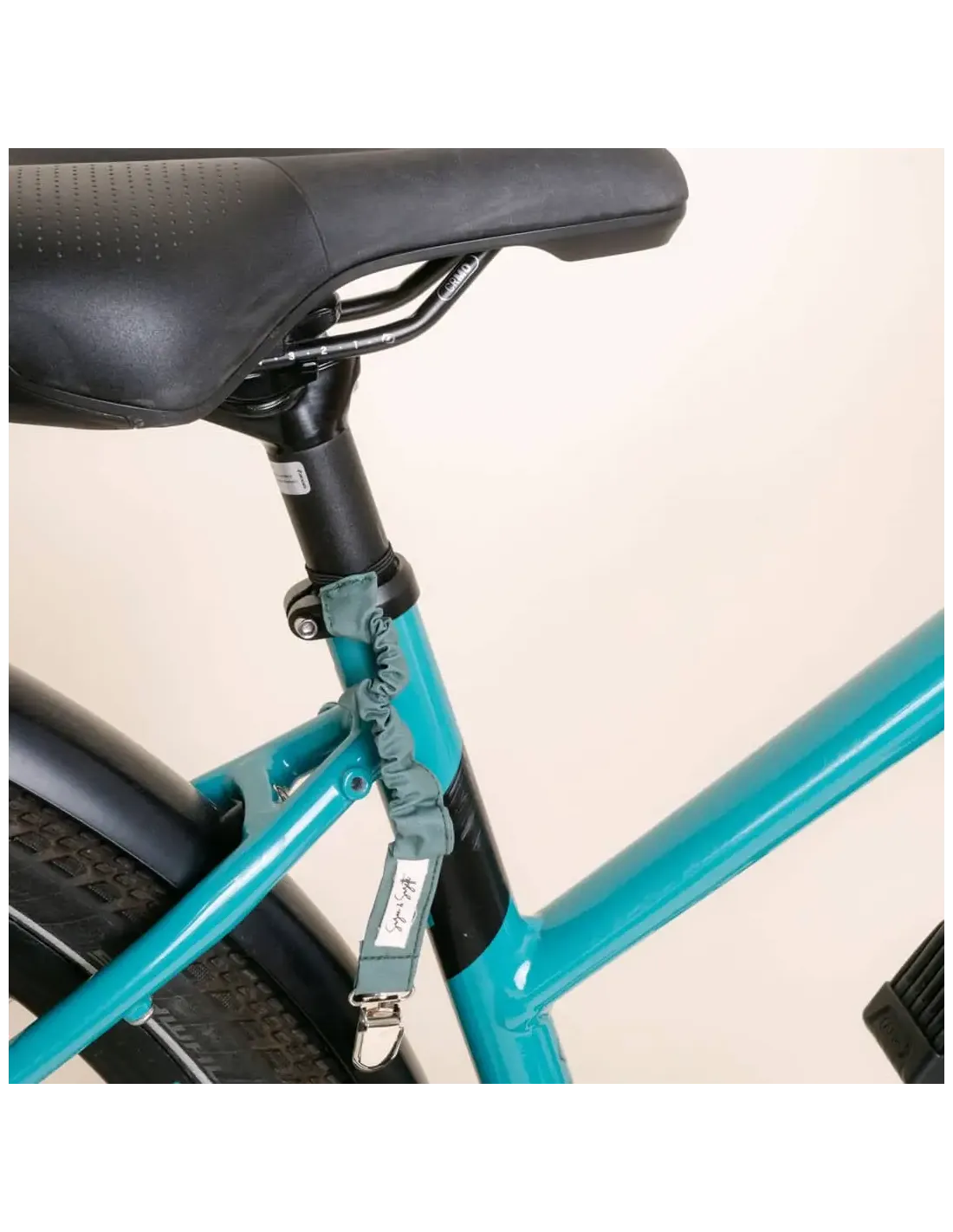 Le principe est simple : il suffit de nouer la partie élastique sous la selle du vélo et de clisper ensuite votre jupe ou votre robe entre vos jambes à l'aide de la pince à l'opposé.