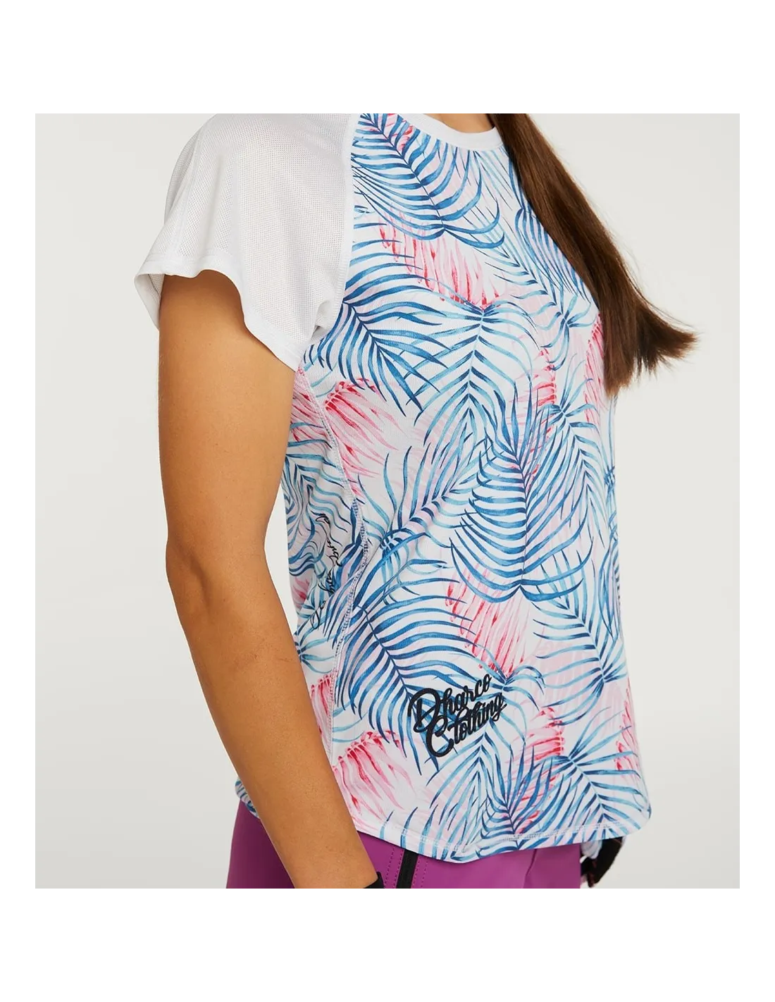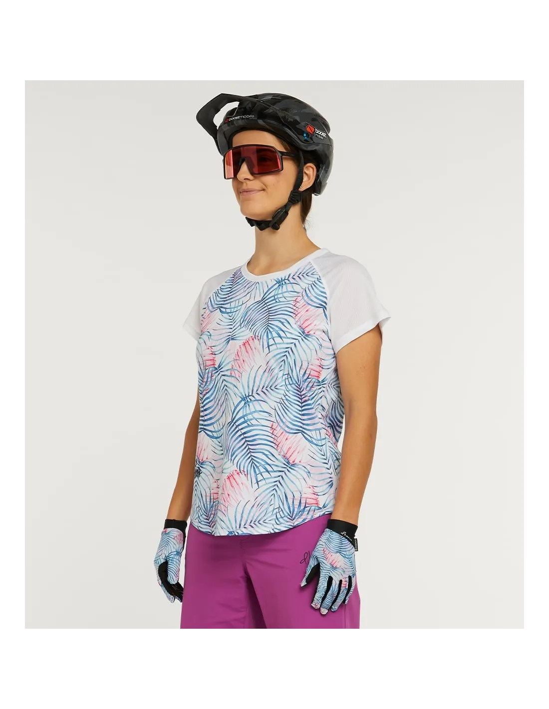Découvrez le charme unique de ce tee-shirt de VTT féminin, alliant esthétique tropicale et technicité pour le plus grand confort des vttistes chevronnées.